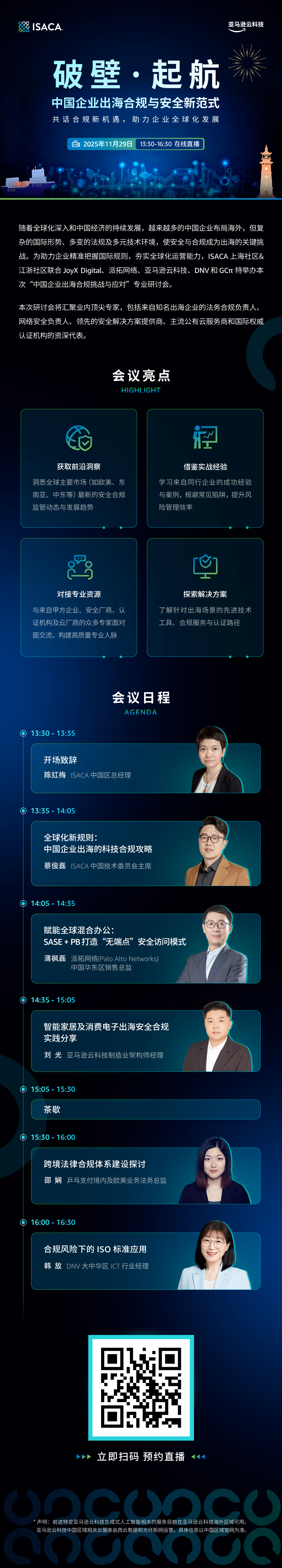 企业出海如何筑牢合规安全防线?亚马逊云科技邀您共话合规新机遇 | 内附直播预约链接![]() 破壁·起航 中国企业出海合规与安全新范式 2025年11月29日 亚马逊云科技在线直播 共话合规新机遇,助力企业全球化发展 随着中国经济的快速发展和全球化浪潮的推进,中国企业出海已从单纯的“产品出海”迈入“体系深耕”的新阶段。在企业出海的征程中,合规与安全一直以来都是不可忽视的重要因素,合规与安全不再是可选成本,而是企业扎根全球市场的“准入密钥”与核心竞争力。 当前,数智化转型进程不断深入,国际形势和法规复杂多变,全球安全合规监管收紧,对企业出海提出了新要求。站在数智技术变革与全球化交汇的历史拐点上,“AI+合规”“云原生安全”成为出海新趋势,合规体系的完善程度直接决定企业全球化的深度与广度。 在复杂的国际形势环境下,企业出海面临多重安全合规方面的考验。由于国际经济形式不稳定性,各国的关税法案不断调整变化,不确定性让企业面临着业务暂停风险;而不同国家和地区的法规体系差异显著,在投资审批、用工政策、海关规定、运输管理等方面,企业稍有不慎可能会面临巨额罚款的惩罚性措施,企业国际信誉受损;同时,随着数智技术的迭代,网络安全风险持续升级,AI 驱动的定向攻击、供应链漏洞等新型威胁频发,数据泄露与合规狙击成为出海企业的高频隐患。值得一提的是,部分企业仍缺乏系统性合规思维,对目标市场监管障碍预判不足,常陷入被动应对的困境,难以适应全球化运营的精细化要求。 面对以上诸多挑战,企业需要构建“体系化、数智化、本地化”的合规安全新范式,方能立足于国际竞争。一方面要将合规内化为业务流程的核心环节,结合目标市场规则,联合云服务商制定定制化方案,筑牢基础防线;另一方面借助数智化工具,搭建“国际+本土”协同机制,联动国家化的法律团队和当地服务伙伴,将供应链安全纳入管控体系,形成全链路风险防控网络。 ![]() 为助力企业精准把握国际规则,夯实全球化运营能力,11月29日,ISACA上海社区&江浙社区联合 JoyX Digital、派拓网络、亚马逊云科技、DNV 和 GCπ 特举办,“中国企业出海合规挑战与应对”专业研讨会。 获取前沿洞察:洞悉全球主要市场(如欧美、东南亚、中东等)最新的安全合规、监管动态与发展趋势; 借鉴实战经验:学习来自同行企业的成功经验与案例,规避常见陷阱,提升风险管理效率; 对接专业资源:与来自甲方企业、安全厂商、认证机构及云厂商的众多专家面对面交流,构建高质量专业人脉; 探索解决方案:了解针对出海场景的先进技术工具、合规服务与认证路径。 本次研讨会将汇聚业内顶尖专家、知名出海企业的法务合规负责人、网络安全负责人、领先的安全解决方案提供商、主流公有云服务商和国际权威认证机构的资深代表,聚焦出海合规话题,直击合规痛点,解锁企业全球化发展的新机遇。 扫描图中二维码或点击阅读原文 立即预约 开启企业出海新机遇 ![]() |