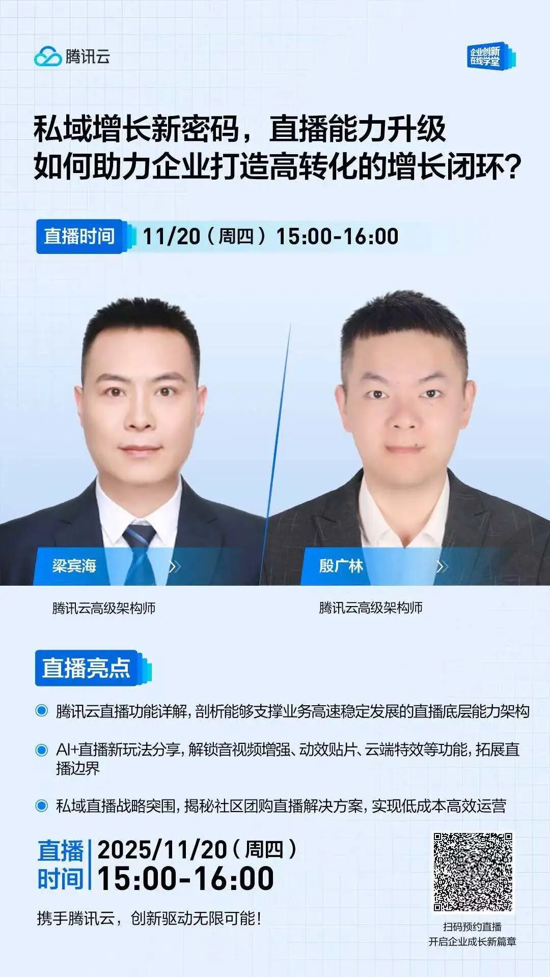 倒计时1天!私域增长新密码,腾讯云技术专家带您打通高转化闭环 | 内附直播链接随着数字化转型进程的加速,直播、流量激活等成为企业获客的重要手段,但是,由于流量红利见顶、公域获客成本居高不下,私域增长日益发展成为企业实现直播引流、获客复购的关键引擎,更是企业实现长效增长的核心阵地。 在AI时代快速发展背景下,人工智能技术虽然带来诸多可能,但是,部署AI+直播技术要求高,部署成本高,中小企业往往望而却步。如何推动企业直播实现从“单一功能”到“系统能力”的全面升级,成为企业私域增长的待解难题。 对企业而言,实现“引流-留存-转化-复购-裂变”全链路私域增长闭环,必须要进行直播能力升级。私域增长的本质,是通过持续的价值输出和深度互动建立用户与品牌的长期信任。直播能力的升级,能够更好建立“信任链接”,让每个环节相互赋能、循环增益,形成增长闭环持续迭代的良性循环。 然而,直播并非新鲜事物,但要真正融入私域增长闭环,对大多数企业而言并非易事,用户留存难、获客成本高、社区复购差、增长转化达不到预期等成为企业面临的困境。 为提升直播能力,打造适配私域场景的高转化增长闭环,腾讯云企业创新在线学堂将于11月20日直播,腾讯云技术专家做客直播间,聚焦直播增长、AI+直播以及私域直播战略等核心话题,拆解平台运营策略、解析私域直播全栈能力,助力企业打造直播增长新引擎。 构建底层能力:腾讯云直播功能详解,剖析能够支撑业务高速稳定发展的直播底层能力架构 拓展AI+直播边界:AI+直播新玩法分享,解锁音视频增强、动效贴片、云端特效等功能,拓展直播边界 揭秘私域增长战略:私域直播战略突围,揭秘社区团购直播解决方案,实现低成本高效运营 2025/11/20(周四)15:00-16:00 梁宾海 腾讯云高级架构师 殷广林 腾讯云高级架构师 扫描图中二维码或点击阅读原文 立即预约直播 打造私域直播能力 ![]() |