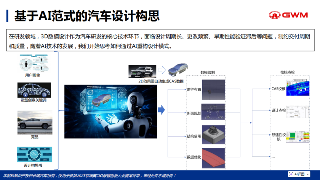 智能设计Agent挑战及实践 随着AI发展,汽车产业竞争已从燃油动力为主的电子化,转向辅助驾驶、智能座舱等智能化领域,汽车行业已进入 AI 化新阶段。AI 的影响不仅覆盖汽车产品与服务,更延伸至汽车全业务链的数字化、智能化层面。 针对AI的发展,无论是传统机器学习,还是深度学习,以及以大模型为代表的生成式AI都在企业内部具备广泛应用的机会。面对不同机会环境,核心可归为两点:一是替代部分业务环节,其能对内容生成、机器翻译、代码生成等领域的原有模式形成变化与替代;二是业务重构,也是当前应用较多的方向,大模型重构交互界面或改变原有形态,并不会改变原有业务和信息系统。 在研发领域,3D数模设计作为汽车研发的核心技术环节,行业内普遍存在设计周期长、更改频繁、早期性能验证滞后等问题,制约交付周期和质量,随着AI技术的发展,我们开始思考如何通过AI重构设计模式。 长城汽车在汽车研发设计过程中面临多重核心痛点:一是专业性要求极高,专业软件与企业自有知识体系学习难度大,新人培养需长期培训与实践,周期长、成本高;二是知识应用脱节,沉淀的大量设计知识与实际需求衔接不足,内外部参考数据分散于个人或个别系统,查找依赖“找与问”,效率低下;三是工业软件操作复杂,自研工具数量多,存在查找难的问题;四是数据分散且管理混乱,虽推进数字化转型拉通设计流程,但数据仍散落于各系统,跨系统查找困难;五是操作问题频发,工具应用中的命令查找、报错解读等问题需反复咨询,整体呈现学习成本高、智能化程度不足的现状。
