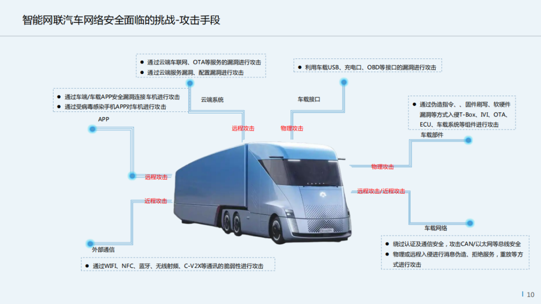 福田汽车隶属于北汽集团商务车板块,是中国品种最全、规模最大的商用车企业,中国首个千万级“双自主”商用车企。产品涵盖轻卡、微卡、重卡以及环卫车、冷链车等特种车,还通过与北京公交集团成立的欧辉合资公司生产北京地区的公交车。 目前,北汽福田并非属于传统意义上的整车制造企业,核心零部件领域与戴姆勒、康明斯柴福等有合作,同时布局智能驾驶、车联网、碳管理等数字科技领域,甚至,在金融租赁、电池租赁等业务都能带来丰厚获利,后市场方面发力显著。北汽福田产品和服务覆盖全球130个国家和地区,正在打造集车辆与移动装备、零部件、数字科技、商业生态为一体的业务架构体系。 福田汽车业务版图广阔,不仅国内布局完善,2004 年就已出海,产品销往世界各地,车联网业务也逐步拓展至海外,目前聚焦东南亚、欧盟、拉美、非洲四个区域,六十多个国家已推进相关业务,因此,在安全方面面临诸多挑战。 首先,合规层面的挑战尤为突出,在国内,不仅要遵循网络安全、数据安全和个人信息保护等网络与数据安全三驾马车,还需要遵循包括个人信息保护、数据安全技术敏感信息强标在内的多项法律法规;在国际上,则要适配不同国家的法律,仅在欧盟售卖车辆并推广车联网就需遵守约十个法律,并且需要参与欧盟相关律所的培训。 其次,智能网联汽车发展趋势也带来新挑战,福田即将推出的重卡等车型智能化程度高,从 L0 到 L5 级别的发展中软件定义成分不断增加,其自动驾驶涉及相关代码量达一亿行甚至更多,安全部门保障车辆及代码安全的难度极大。同时汽车外设也暗藏风险,T-Box、IVI、蓝牙等组件在实现便捷功能时,可能出现蓝牙钥匙被盗用等问题;安全人才的缺乏也是一大难题,熟悉企业安全的人才对车安全几乎不了解,而了解车安全的研究院人员又不懂企业安全,且多数企业中车安全与企业安全工作分家,难以统筹融合。 第三,智能网联汽车网络安全风险攻击手段多样,通过WIFI、NFC、蓝牙、无线射频、C-V2X等通讯的脆弱性进行攻击;各类网络攻击手段在汽车上均有可能出现,还可能通过车联网渗入车联网平台、CRM 及 ERP 等系统。 第四,大模型的应用还让攻击手段进一步升级,其生成高水平钓鱼邮件、攻击工具开发和高对抗攻击Payload成本远低于以往,加剧了安全防护的压力。 最后,安全运营方面面临严峻挑战,从物联网资产探测到人才缺乏,以及新攻击手法等让运营难度增大,而且海外各节点脱离总部管控,各地法律法规差异化大,安全人员沟通成本高,致使全球化运营复杂度高。 总之,智能网联汽车作为物联网的重要分支,面临诸多待解的挑战:一是其安全边界已日益模糊,传统网络防护框架面临根本性挑战;二是系统复杂性与数据量的爆发式增长,带来全面的数据安全和合规性风险;三是安全运维体系碎片化,来自不同国家的各类安全产品形成孤岛,致使问题追溯与协同处置极为困难;四是新型攻击手段愈加隐蔽,例如AI驱动“银狐”等勒索软件,对响应速度提出极限要求;五是全球化运营带来高层级管理挑战,跨时区、跨语言的安全团队协同沟通成本与效率问题凸显。