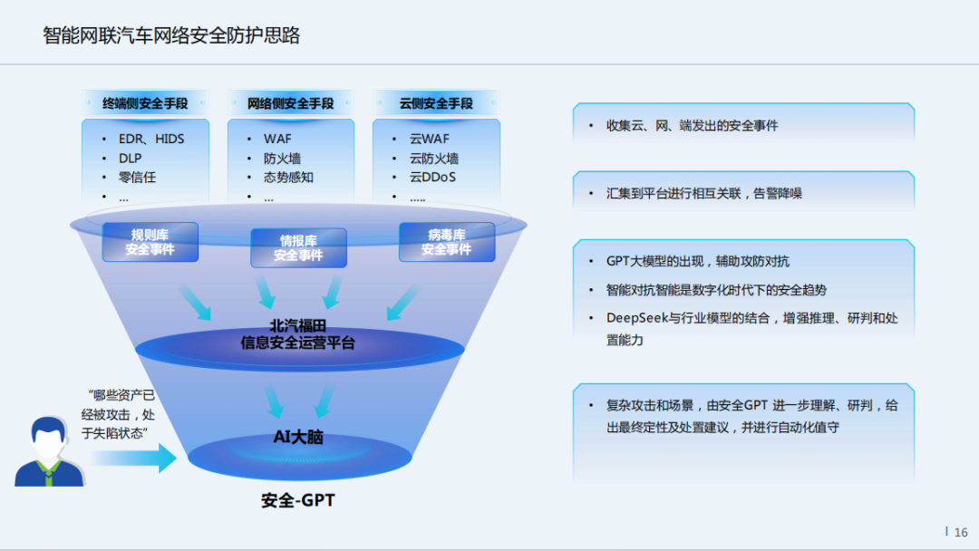 北汽福田张志强:AI助力“车+企业”新一代信息安全体系实践导读:本文来自北汽福田全球信息安全负责人&DPO、欧辉新能源客车网络安全高级部长张志强,在以“智联·聚势·领航”为主题,2025京津冀CIO数智创新大会AI专场上发表的主题演讲,包括以下精彩内容: